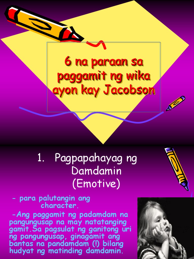 Gamitin ang tungkuling ito sa mga akdang pampanitikan tulad ng tula nobela at maikling katha kwento heuristik. Ang tema ng pagdiriwang ng Buwan ng Wika ay pakikiisa ng Komisyon sa Wikang Filipino KWF sa 2021 Quincentennial Commemorations in the Philippines 2021 QCP na nakatuón sa mahahalagang pangyayari sa bansa sa nakalipas na 500 taón partikular na sa Kautusang Tagapagpaganap Blg. Karamihan sa mga gumagamit ng wika ang higit na nagbibigay-pansin sa kahulugan sa halip na sa anyo kung paano ipinahahayag ang wikang ginagamit ngunit sa katunayan ang kahulugan ng sinasabi ng nagsasalita ay nababatay sa anyo at paraan ng pagsasalita.