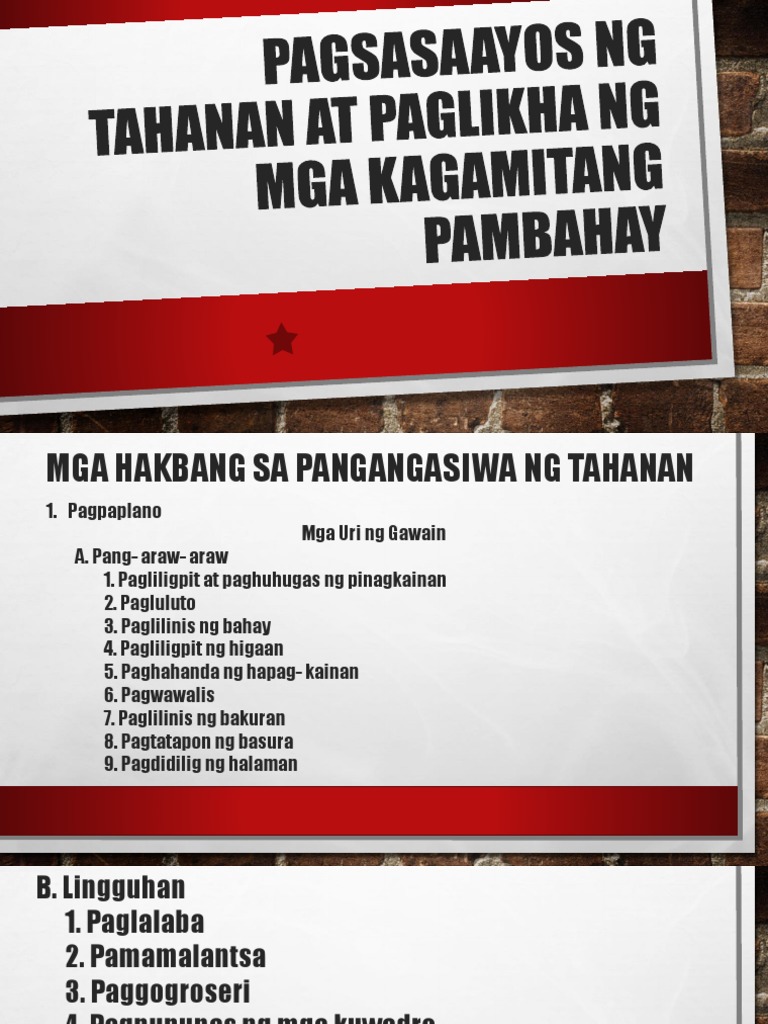 Ppt he 5 ang mga tungkulin sa pagsasaayos ng tahanan. Tungkulin ng mga bata sa pagtulong sa gawain sa tahanan. Ito ay kanilang ginagampanan para sa ikabubuti at ikauunlad ng ating bansa. Sa araling ito matututunan ng mga mag-aaral ang ibat ibang paraan at tuntuning dapat tandaan sa pag-aayos ng mga silid sa tahanan mga akmang kagamitan at kasangkapan na magbibigay ganda sa tahanan gayundin ang kabutihang dulot ng pagsasaayos nito.