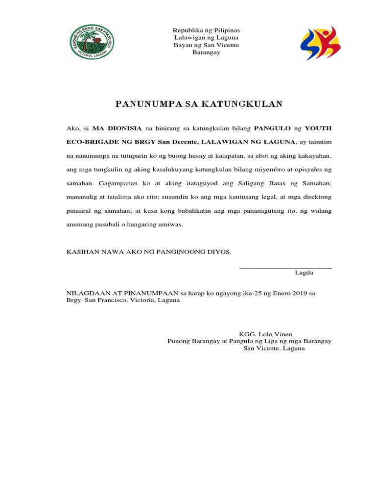 Nagdarasal ako bago matulog at paggising sa. Samahan ng Kabataan ng Sta. PANUNUMPA SA KATUNGKULAN ___oOo___ Ako si _____ ay taimtim na nanunumpa na tutuparin kong buong husay at katapatan sa abot ng aking kakayahan ang mga tungkulin na nakasaad sa kontratang aking nilagdaan bilang _____ ng ____ PSSUPT FERDINAND M GARAY RCDS administered the Panunumpa sa Katungkulan and PCINSP JOVEN M BAGAYGAY OIC RPHRDD led the Panunumpa ng Kawani ng.