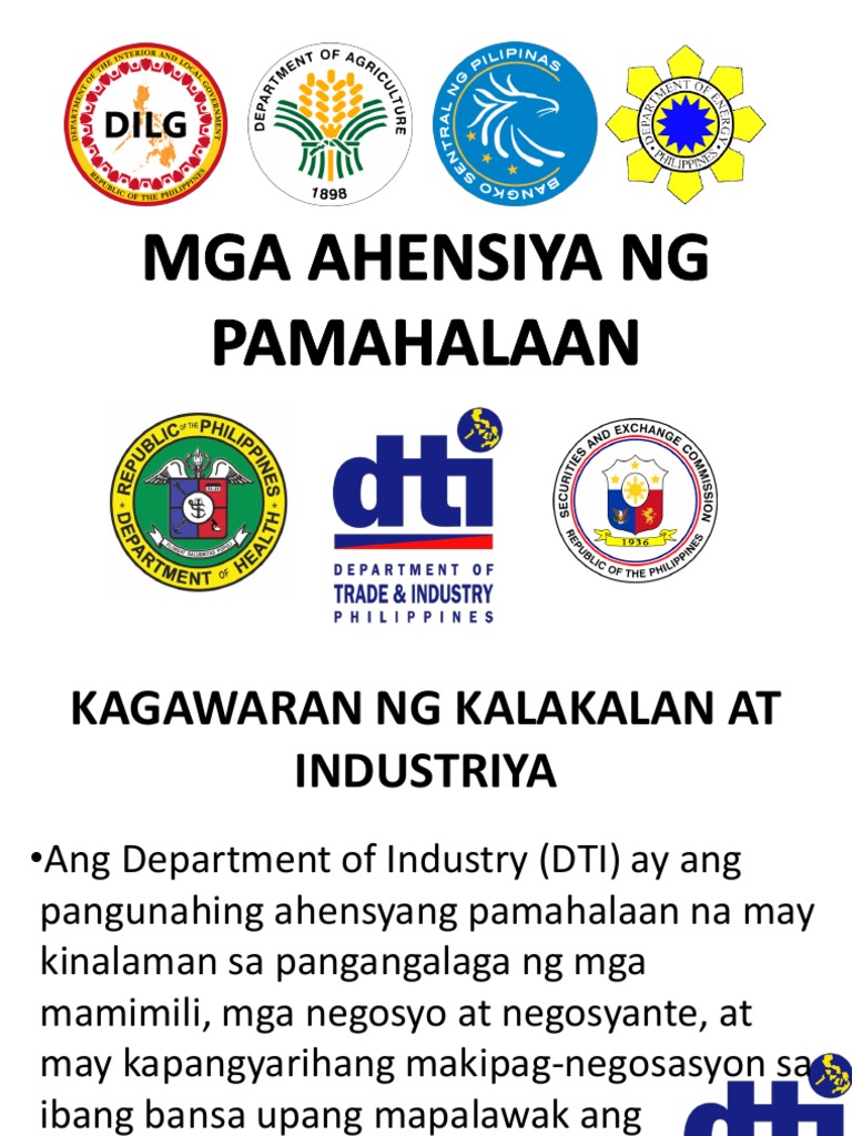 Ang sumusunod ay ang mga pananagutang binabanggit. Isa rin itong regulatory body o isang institusyon na may kakayanang magbigay ng. Ang Kagawaran ng Kalakalan at Industriya ng Pilipinas o Department of Trade and Industry DTI ay isang kagawa ran ng sangay tagapagpaganap ng Pamahalaan ng Pilipinas na inaatasang palawigin ang kalakalan at industriya sa Pilipinas sa pamamagitan ng paggawa ng mga bagong hanapbuhay at magtaas sa kinikita ng mga Pilipino.