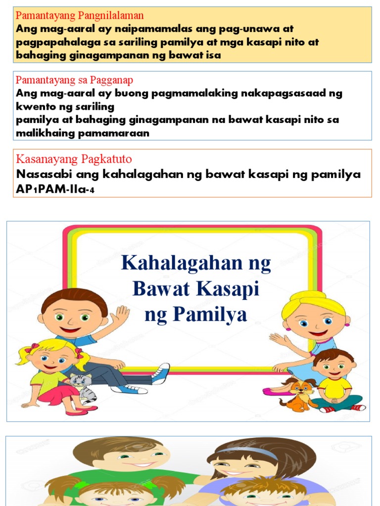 Tungkulin ng bawat kasapi ng mag anak. Sabihin sa mag-aaral na gumuhit ng isang simbolo na nagpapakita na ang bawat kasapi ng pamilya ay mahalaga. Ang tungkulin bilang mag aaral ay paggawa ng mga bagay na nagpapakita ng pagpapahalaga sa pag aaral. Ang ama ay dapat mag-ukol ng panahon sa bawat isa sa kanyang mga anak.